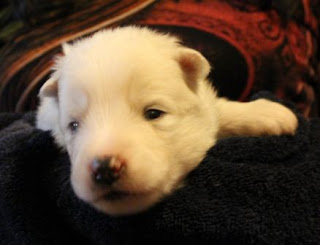 So we have eyes that are open and every day they can see better. This week they will be working on opening their ears so that they can finally hear us cooing over them :0). Every day they get better at moving around and the puppy rail will soon have to come out. Well here they are with my daughter holding them and trying to get some still head shots. Full puppy shots were way to hard this time around.